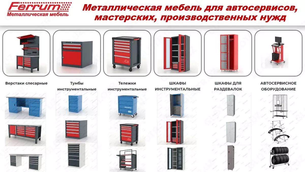 - металлическая мебель серии "Феррум" – стандартная серия мебели для организации рабочих мест в авто сервисных слесарных цехах, ремонтных зонах и производственных цехах, где не требуется жесткая эксплуатация. Также мебель этой серии с успехом используется как офисная.